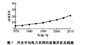 汽車(chē)電源的電壓從上世紀(jì)50年代的6V改為12V,己有50多年的歷史。自1990年開(kāi)始,汽車(chē)用電量每年以5%~8%的比例增加,其平均電力負(fù)荷的發(fā)展歷史與趨勢(shì)見(jiàn)圖1。隨著汽車(chē)技術(shù)的不斷進(jìn)步,將會(huì)有越來(lái)越多的電氣及電子系統(tǒng)被應(yīng)用到汽車(chē)上。