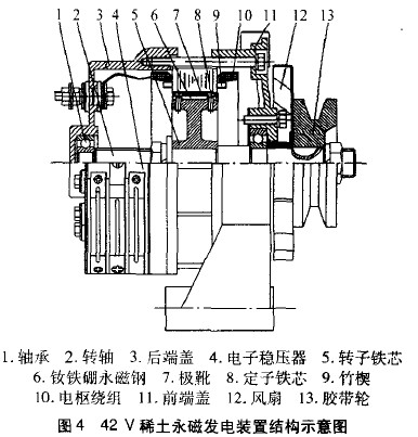 目前稀土永磁材料已經(jīng)具備了較高的性?xún)r(jià)比,現(xiàn)代電力電子技術(shù)也為研制出斬波式的電子穩(wěn)壓器奠定了基礎(chǔ)。因此,利用稀土永磁材料和現(xiàn)代電力電子元件研制出結(jié)構(gòu)簡(jiǎn)單、發(fā)電效率高、壽命長(zhǎng)的42V稀土永磁發(fā)電機(jī)具有較高的研究?jī)r(jià)值和廣闊的推廣前景。