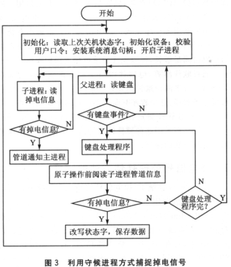 另一種方式是采用守候進程的方式,開通一個進程,此進程專門等待中斷信號。主程序根據(jù)數(shù)據(jù)操作對象的不同,將自己的流程方案劃分成若干原子操作,所謂原子操作即劃定的程序塊要么完全執(zhí)行,要么不執(zhí)行。每個操作對應(yīng)惟一狀態(tài)標(biāo)志。在每個原子操作前,主進程都將會通過管道通信的方式閱讀中斷信號。如果中斷信號產(chǎn)生,主進程首先保存狀態(tài)標(biāo)志,然后將相關(guān)數(shù)據(jù)寫往Flash后退出,電源恢復(fù)后,主進程首先根據(jù)標(biāo)志字確定系統(tǒng)恢復(fù)方案。圖3用流程圖的方式實現(xiàn)這一過程。