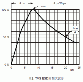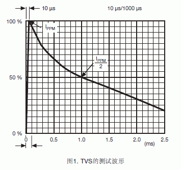 TVS的額定功率是在一定測(cè)試或應(yīng)用條件下吸收浪涌的能力。10μs/1000μs脈沖波形的工業(yè)標(biāo)準(zhǔn)測(cè)試條件(Bellcore 1089標(biāo)準(zhǔn))如圖1所示。這個(gè)測(cè)試條件不同于8μs/20μs脈沖波形的TVS瞬態(tài)電壓吸收能力測(cè)試條件,如圖2所示。