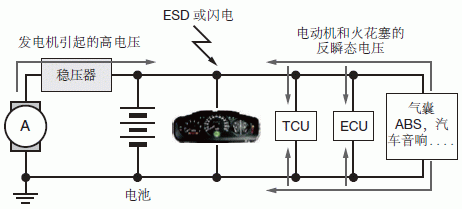 電子控制單元、傳感器和信息娛樂系統(tǒng)等汽車電子設(shè)備連接在一根電源線上(圖4)。這些電子產(chǎn)品的電源是電池和交流發(fā)電機(jī),這兩種電源的輸出電壓都不穩(wěn)定,容易受溫度、工作狀態(tài)和其他條件影響。此外,使用燃油噴射系統(tǒng)、閥、電機(jī)、電氣和水解控制器等電磁線圈負(fù)載的汽車系統(tǒng),會(huì)把ESD、尖峰噪聲和其他類型的瞬態(tài)和浪涌電壓引入到電源和信號(hào)線上。