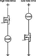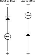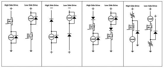 對(duì)于將大功率MOSFET用于各種負(fù)載的固態(tài)開關(guān)動(dòng)作的電子模塊,其他極性接反的情況主要集中在驅(qū)動(dòng)配置的高壓側(cè)或低壓側(cè)(見圖3a)。在極性接反的狀態(tài)下,大功率MOSFET的內(nèi)在二極管變?yōu)檎蚱?,并允許電流能夠流至與其連接的電機(jī)、燈或電磁閥負(fù)載(見圖3b)。