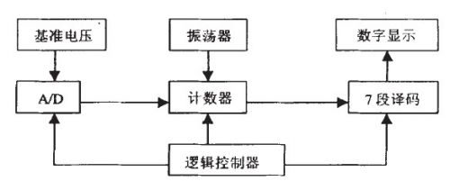 放大后的模擬電壓經(jīng)過A/D轉(zhuǎn)換器實(shí)現(xiàn)模擬量到數(shù)字量的轉(zhuǎn)換。A/D轉(zhuǎn)換結(jié)果通過計(jì)數(shù)譯碼電路變換成7段譯碼,最后驅(qū)動顯示出相應(yīng)的數(shù)值, 傳感器驅(qū)動顯示電路方框圖如圖6所示。
