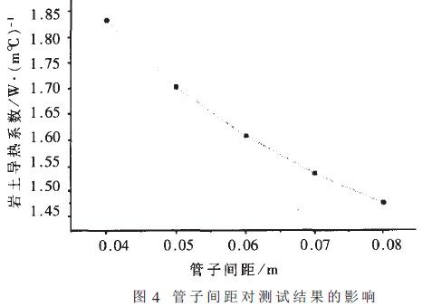 維持其它條件不變,只改變導(dǎo)管上升管與下降管之間的間距,其對巖土導(dǎo)熱系數(shù)的影響見圖4。當(dāng)管間距變化約為0.0lm時(shí).計(jì)算出的導(dǎo)熱系數(shù)變化約為4~8%。由圖中可以看出,間距越大,計(jì)算出的導(dǎo)熱系數(shù)越?。哼@是由于間距越大,鉆孔內(nèi)的熱阻越小,在總熱阻不變的情況下.周圍巖土的導(dǎo)熱熱阻大。即導(dǎo)熱系數(shù)小。因此如何確定管于間距是設(shè)計(jì)地源熱泵系統(tǒng)中值得認(rèn)真探討的問題。