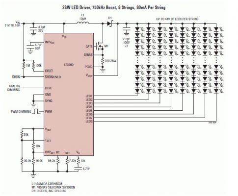 - 采用 LT3760、效率為 90% 的 28W LED 背光照明電路