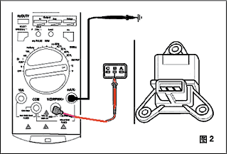 2.關(guān)閉點(diǎn)火開關(guān),斷開傳感器的電子連接接頭。黑色表筆插到儀器的“OUTPUT—”的插孔,另一端搭鐵(使用鱷魚夾),紅色表筆插到“+OUTPUT”插孔,另一端與傳感器的輸入信號(hào)線連接(可以使用萬(wàn)用測(cè)試線),如圖2所示。