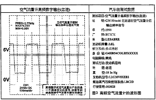 高頻數(shù)字式空氣流量計(jì)出現(xiàn)在通用汽車3.8L V6型發(fā)動(dòng)機(jī)上,它是日立(Hitachi)生產(chǎn)的傳感器。此外,高頻數(shù)字式空氣流量計(jì)還應(yīng)用于凌志(Lexue)以及其它汽車中。傳感器的脈沖大多數(shù)幅值為5V,怠速時(shí)頻率:2.77kHz。