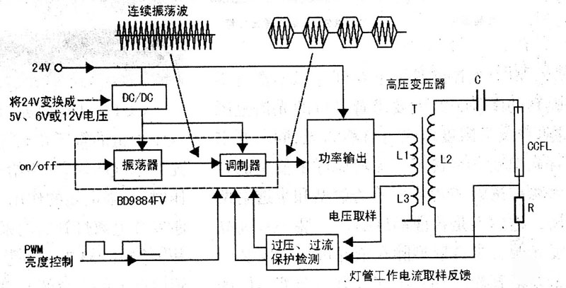 加電后,當(dāng)背光燈驅(qū)動(dòng)板收到CPU送來(lái)的“ON”信號(hào)(常見(jiàn)為高電平啟動(dòng),多為3V~5V)后,控制振蕩器開(kāi)始工作,產(chǎn)生頻率為30kHz~lOOkHz的振蕩信號(hào)送入調(diào)制器內(nèi)部,對(duì)CPU送來(lái)的PWM亮度調(diào)節(jié)信號(hào)進(jìn)行調(diào)制,調(diào)制后輸出斷續(xù)的30kHz~lOOkHz激勵(lì)信號(hào)驅(qū)動(dòng)功率輸出電路,經(jīng)高壓變壓器升壓后輸出高壓并點(diǎn)亮背光燈管。