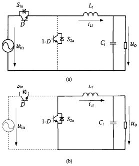 當開關管S1a開通、S2a關斷時,輸入電壓通過開關管S1a的反向二極管、電感Lf給電容Cf和負載供電,如圖3(a)所示;當開關管S1a斷開,S2a開通時,電感電流iLf經Lf、開關管S2a、Cf和負載續(xù)流,Lf和Cf共同向負載供電,如圖3(b)所示。