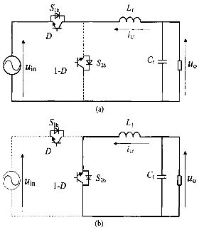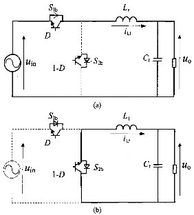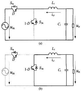 當開關管S1b開通、S2b關斷時,輸入電壓通過開關管S1b、電感Lf給電容Cf和負載供電,如圖4(a)所示;當開關管S1b斷開,S2b開通時,電感電流iLf經Lf、開關管S2b的反向二極管、Cf和負載續(xù)流,Lf和Cf共同向負載供電,如圖4(b)所示。