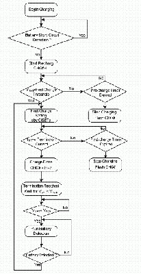 圖6所示為鋰離子電池充電器的標準充電流程,首先充電IC偵測是否有輸出短路或是過載的保護模式,若系統(tǒng)一切正常接著偵測電池初始電壓是否達到 3V以上,高于3V者就直接以快充模式進行高電流充電,若電池低于3V者,進入預充電模式,以快充的10%進行充電,喚醒電池并避免電池損壞。在預充電階段,仍隨時偵測電池電壓,達到3V后可隨即切入快充模式。