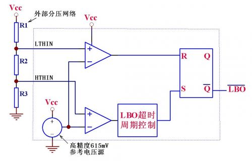 IC內(nèi)含一個高精度的615mV基準電壓源、兩個比較器、一個RS觸發(fā)器和其它一些邏輯電路,其大致功能是:VCC電壓或其它待檢測電壓通過R1-R3組成的分壓網(wǎng)絡接在IC的LTHIN /HTHIN檢測引腳,當待測電壓下降導致LTHIN引腳低于615mV時,輸出腳LBO輸出低電平,而如果待測電壓上升導致HTHIN引腳高于615 mV時,經(jīng)過內(nèi)部邏輯判斷和簡單延時后,輸出腳LBO輸出高電平。