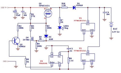 至此大家想必也大致了解了圖三的工作流程了:接上電池和充電器,如果電池電壓低于2.8V,則U1輸出為低(U2輸出也是低),這樣R3和R4的回路都不通,只有R2回路導通,給Q1提供微弱的導通,使之輸出約數(shù)毫安的電流給電池進行預充電,當電池電壓上升到超過2.94V(1.05X2.8)時或者剛接上電池電壓就超過2.94V時,U1輸出高電平而U2繼續(xù)輸出低電平(電池電壓還沒達到4.2V J),這時R2通路截止而R3通路導通(因為Q4導通且其源極電平為低-因U1輸出拉低),從而由較小阻值的R3令Q1完全導通,提供一個數(shù)百毫安的大電流恒流充電,而當這個恒流充電過程慢慢令到被充電的Li+電池端電壓上升到4.2V時,U2也輸出高電平從而關閉Q4,但是它同時也給U3提供了電源導致U3開始工作,這樣U3觸發(fā)Q3使R4導通提供一個很小的補充充電電流,直至U3達到定時時間從而關閉Q3,這時整個充電過程才完全結(jié)束。