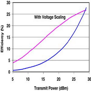 動態(tài)/可適性電壓調(diào)整技術(shù)(DVS/AVS)與高整合度組件所使用的方式很類似,它會把閉回路系統(tǒng)中的處理器和穩(wěn)壓器連結(jié)在一起,并在確保系統(tǒng)正常工作的情形下,將數(shù)字電源供應(yīng)的輸出電壓動態(tài)調(diào)整至最小值。功率放大器會被最佳化,使它在最大傳送功率下?lián)碛凶罡咝?。由于絕大多數(shù)手機(jī)都在基地臺附近工作,手機(jī)的無線電功能會在維持通訊質(zhì)量的前題下,將傳送功率降至最低水平。當(dāng)功率放大器在較低的功率水平下工作時(shí),它的效率會受到影響,從(圖三)可以看出,利用動態(tài)電壓調(diào)整技術(shù)來調(diào)整功率放大器的電壓,它的工作效率會增加10%至20%。
