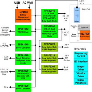 在這個解決方案中,就算鋰離子電池下降至3.3V 左右,在100%負(fù)載周期模式下工作的高效率TPS62200降壓轉(zhuǎn)換器仍能提供3.3V 的I/O電壓。上述所有零件都采用SOT-23 封裝,除了bq24020 電池充電組件、TPS61020 升壓轉(zhuǎn)換器以及TPS61042 白光二極管驅(qū)動組件之外,它們是采用3×3 平方厘米的QFN 封裝。TPS61040 和TPS61042 還內(nèi)建上端FET 晶體管,每顆組件只需要一個外接二極管。bq24020、TPS622xx、TPS61020 和線性穩(wěn)壓器組件全都內(nèi)建FET 晶體管,功率放大器和中央處理器電源采用的動態(tài)電壓調(diào)整技術(shù)可以提高每顆零件的效率,進(jìn)而協(xié)助降低功耗。