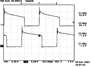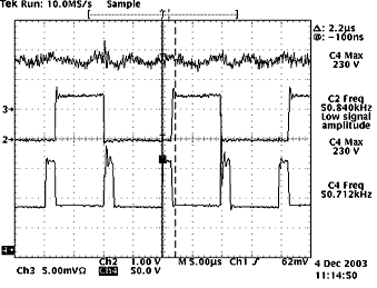 (b)圖中,示意了隔離變壓器副邊輸出的兩路驅(qū)動波形,可以直接驅(qū)動開關(guān)管。從圖中可以看出驅(qū)動波形比較理想:有快速的上升沿,并在一開始有一定的過沖,可以加速開通,減小了開通損耗;同時(shí),有反偏截止電壓,提供了足夠的反相門極驅(qū)動,減小了下降時(shí)間;很好地驗(yàn)證了驅(qū)動電路的設(shè)計(jì)是合理的。