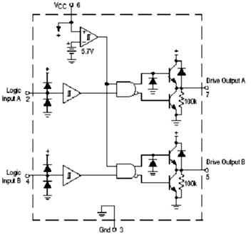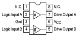 MC34152的外圍電路簡單,應(yīng)用方便。它是8管腳的同相推挽驅(qū)動芯片,具體的內(nèi)部結(jié)構(gòu)和封裝如圖4所示。2,4腳為兩路控制信號輸入,經(jīng)過芯片內(nèi)部的推挽放大,直接輸出同相的兩路驅(qū)動信號(7,5腳)。為使芯片更加穩(wěn)定地工作,一般在芯片的電源端并聯(lián)一個(gè)濾去高頻干擾的瓷片電容和一個(gè)濾去低頻干擾的電解電容。