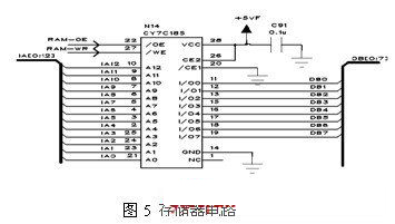 通過軟件參與設置,很容易得到全頻段內(nèi)的預置誤差數(shù)據(jù)。對于2-20GHz的微波振蕩器,如果每隔5MHz設置補償一個點,那么存儲器至少需要3600個地址空間,在此選擇8k×8靜態(tài)存儲器芯片,存儲空間滿足要求。在時鐘的同步控制下,地址生成器產(chǎn)生對應地址,該系列數(shù)據(jù)被存入RAM中,電路如圖5所示。