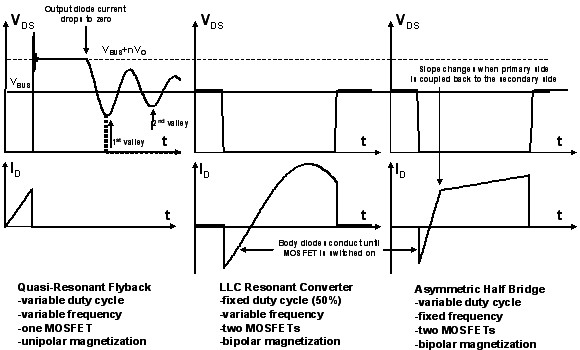 圖1所示為采用三種不同拓?fù)?(準(zhǔn)諧振反激式拓?fù)?、LLC諧振拓?fù)浜褪褂密涢_關(guān)技術(shù)的非對(duì)稱半橋拓?fù)? 的開關(guān)的電壓和電流波形。