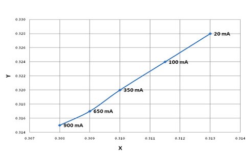 使用減小電流的方法進行LED調光類似于大多數(shù)白熾燈泡使用的調光方法。這種減小電流的方法在為數(shù)不多的應用中可以接受,但隨著光等級降低,LED發(fā)出的光色彩也根據(jù)電流而變化。電流較小時,色度(Chromaticity)朝向黃色變化。圖1顯示不同電流時的典型色度變化。