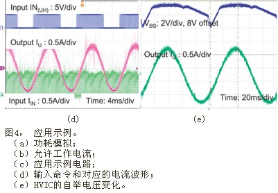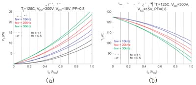 圖4給出了本模塊的一個(gè)應(yīng)用示例。在圖4(a)和(b) 的模擬中,假設(shè)結(jié)區(qū)溫度Tj保持為125℃;該溫度為本模塊的最大工作結(jié)區(qū)溫度。通過(guò)這項(xiàng)模擬,肯定當(dāng)模塊外殼溫度控制在100℃并采用空間向量調(diào)制 (SVPWM) 時(shí),輸出功率可大于Pout=100W,并允許Pd=16W的功率損耗。根據(jù)這些信息,我們利用一臺(tái)130W BLDC電機(jī)(正弦反電動(dòng)勢(shì)) 和圖4(c)所示的電路,對(duì)模塊的額定功率進(jìn)行驗(yàn)證實(shí)驗(yàn)。實(shí)驗(yàn)中采用的散熱片有效表面積約為100cm2。采用該散熱片后,模塊在20kHz SVPWM下可向電機(jī)輸出150W的功率;熱功耗為12W。而此時(shí)模塊的外殼溫度為86℃,MOSFET結(jié)區(qū)溫度為104℃,環(huán)境溫度27℃。在同樣條件下采用圖4(d)所示的非連續(xù)PWM時(shí),由于有效開關(guān)頻率降低,模塊的功耗可達(dá)到8W,而逆變器效率可達(dá)到95%。此時(shí),模塊的外殼溫度為62℃,結(jié)區(qū)溫度為82℃(已考慮電機(jī)鐵芯的損耗),逆變器的損耗為整個(gè)系統(tǒng)功耗的27%