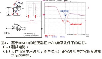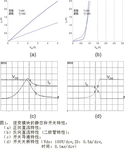 至于其反向特性 (參見圖1(a)),MOSFET中固有的體二極管可充當(dāng)IGBT逆變器中的快速恢復(fù)二極管 (FRD) ;即可以通過(guò)電子擴(kuò)散過(guò)程實(shí)現(xiàn)快速而平滑的恢復(fù)特性,同時(shí)節(jié)省了引線框內(nèi)芯片的占用空間。由于MOSFET比一般FRD尺寸大,其反向壓降小,而且在柵極為高時(shí),該壓降甚至?xí)。@是因?yàn)镸OSFET溝道本身就允許雙向電流。