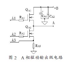 3)直流無刷電機(jī)的驅(qū)動控制:參見圖1,此電路采用三相無刷直流電機(jī)。3 個霍爾位置傳感器的空間間距為120o,輸出信號a、b、c最終送給單片機(jī)作為轉(zhuǎn)子位置檢測信號及測速信號。其中A 相末級電路如圖2 所示,在驅(qū)動電路中設(shè)置了電流檢測。單片機(jī)根據(jù)霍爾轉(zhuǎn)速信號和電流檢測信號,經(jīng)過分析判斷,輸出正確的PWM 控制信號給相應(yīng)的線圈通電,從而控制電動機(jī)的起動、停止及轉(zhuǎn)速等。