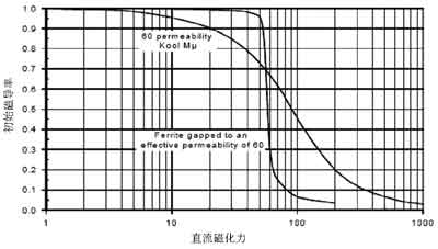 此外,電感磁芯材料也是選擇電感時(shí)應(yīng)該加以考慮的重要因素。常用的磁芯材料分為兩大類,一類是粉狀磁芯,以鐵粉芯、High Flux高磁通磁粉芯以及Kool Mμ為代表;另一類是鐵氧體磁芯。兩種磁芯材料各有優(yōu)缺點(diǎn),設(shè)計(jì)人員在選擇的時(shí)候,應(yīng)根據(jù)成本、性能、尺寸等因素綜合考慮進(jìn)行選擇。相對(duì)粉狀磁芯電感,鐵氧體磁芯的電感具有較低的磁芯損耗,同時(shí)具有較高的開關(guān)頻率(高達(dá)MHz)。因此,鐵氧體磁芯通常是此類應(yīng)用的最佳選擇。當(dāng)然,鐵粉磁芯也有其優(yōu)越性,例如鐵粉磁芯的成本相對(duì)鐵氧體要低得多;另外,粉狀磁芯的電感隨著流過(guò)電感的直流偏置電流的變大要下降得緩慢些,相當(dāng)于具有“軟”飽和特性,而鐵氧體磁芯的電感值在飽和以后就會(huì)迅速下降(見圖1),因此在設(shè)計(jì)的時(shí)候需要留有更多的余量,防止電感出現(xiàn)飽和。如圖1所示,粉狀磁芯的電感值隨著負(fù)載電流的增大下降相對(duì)緩慢。鐵粉磁芯往往是用于一些對(duì)功耗要求不甚敏感,開關(guān)頻率也不高(<200kHz),但注重成本的應(yīng)用場(chǎng)合。