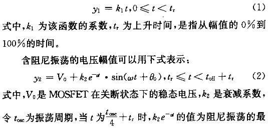 圖1中展示了一MOSFET的漏源極電壓波形,為了研究其上升時(shí)間、下降時(shí)間、阻尼振蕩等對其頻譜的影響,需要確定該波形的特征參數(shù),然后運(yùn)用Matlab編程仿真。由于該波形是由一個(gè)梯形信號(hào)和一個(gè)阻尼振蕩信號(hào)疊加而成,因此可以用分段函數(shù)進(jìn)行模擬。上升沿可以用式(1)表示。
