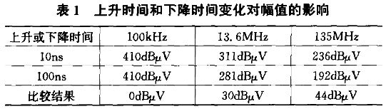開關(guān)信號(hào)的上升和下降沿對干擾的幅值影響很大,圖3是上升時(shí)間或下降時(shí)間為10ns時(shí)的上升沿或下降沿的頻譜,把上升時(shí)間或下降時(shí)間改為100ns再仿真時(shí)發(fā)現(xiàn):當(dāng)上升時(shí)間或下降時(shí)間增加時(shí),隨著頻率的升高,幅值減小的越快,也就是說,上升或下降時(shí)間的變化對高頻干擾幅值影響更大。表1中列出了上升時(shí)間或下降時(shí)間為10ns和100ns時(shí),不同頻率的電磁干擾幅值和比較結(jié)果。從圖中還可以看出在頻率為