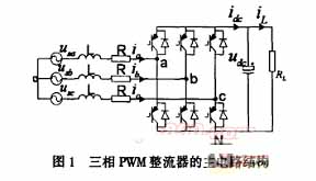圖1是三相PWM整流器的拓樸結(jié)構(gòu),功率開關(guān)按采用的調(diào)制方式動作,由于輸入電感的濾波作用,整流器交流側(cè)可近似認為是三相正弦電流;直流側(cè)有大電容穩(wěn) 壓,輸出呈直流電壓源特性,穩(wěn)態(tài)時輸出直流母線電壓可保持不變,一般情況下,要求控制輸入電流與輸入電壓同相位,通常采用電壓外環(huán)和電流內(nèi)環(huán)的雙環(huán)控制方 式,電壓外環(huán)主要是保證直流輸出電壓穩(wěn)定,電流內(nèi)環(huán)主要是按電壓外環(huán)輸出的電流指令進行電流控制,如實現(xiàn)單位功率因素正弦波電流控制。