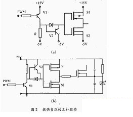 功率MOSFET屬于電壓型控制器件,只要柵極和源極之間施加的電壓超過其閾值電壓就會導通。由于MOSFET存在結電容,關斷時其漏源兩端電壓的突然上升將會通過結電容在柵源兩端產(chǎn)生干擾電壓。常用的互補驅(qū)動電路的關斷回路阻抗小,關斷速度較快,但它不能提供負壓,故其抗干擾性較差。為了提高電路的抗干擾性,可在此種驅(qū)動電路的基礎上增加一級由V1、V2、R組成的電路,產(chǎn)生一個負壓,電路原理圖如圖2(a)所示。