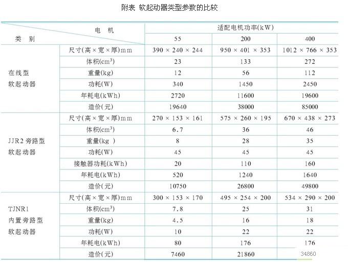 從表中可以看出,旁路型軟起動(dòng)器優(yōu)于在線(xiàn)型軟起動(dòng)器,而內(nèi)置旁路型軟起動(dòng)器的優(yōu)于旁路型和在線(xiàn)型軟起動(dòng)器。但價(jià)格卻是越先進(jìn),成本越低,這是高科技的一般規(guī)律。以附表內(nèi)舉例品牌來(lái)比較,在線(xiàn)型軟起動(dòng)器是旁路型軟起動(dòng)器的1.5倍,旁路型軟起動(dòng)器的是內(nèi)置旁路型軟起動(dòng)器的1.4倍(不算接觸器的價(jià)格)。而能耗比較,在線(xiàn)型軟起動(dòng)器是旁路型軟起動(dòng)器的10倍左右,而旁路型軟起動(dòng)器的是內(nèi)置旁路型軟起動(dòng)器的7倍左右。