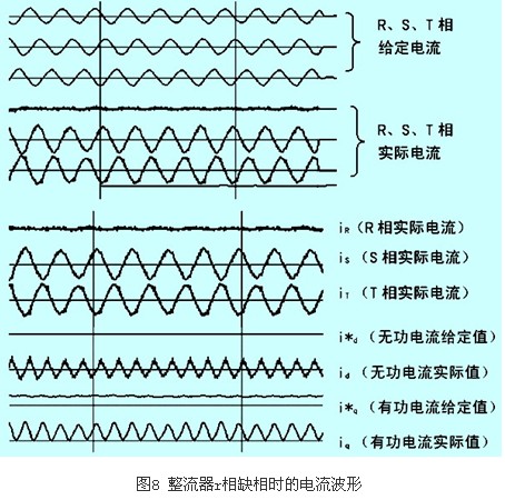 如果由于線(xiàn)路缺相,CT也檢測(cè)不到電流(例如r相電流ir=0),則由于平衡控制會(huì)使另外兩相電流的相位差變?yōu)?80°,幅值相等(當(dāng)然為補(bǔ)償“缺相”的那相電流,另兩相電流將增大),以滿(mǎn)足矢量和為零的控制要求,如圖8所示。此時(shí),根據(jù)r、s、t相實(shí)際電流計(jì)算出的有功分量電流iq和無(wú)功分量電流id已經(jīng)不是正常直流量,而是含有2倍頻(相電流頻率)成份的交流量,參見(jiàn)圖8,整流器無(wú)法正常工作。