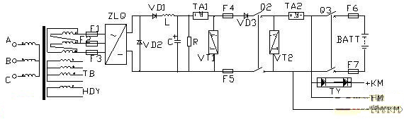圖中VD3的作用是一個逆阻二極管,防止外部電源倒灌充電機(jī)。二極管后邊的開關(guān)就是充電機(jī)輸出開關(guān)。從這里出去的直流分為三路:一路去電池,一路去動力合閘母線,另一路為控制母線提供前級電源。