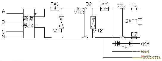⑴ 由于高頻模塊具有良好的輸入過欠壓和輸出過欠壓保護(hù),而且具有良好的限流功能,因此,在輸入側(cè)和輸出側(cè)不需另加熔斷器保護(hù)。由于高頻模塊本身具有電壓電流顯示功能,而且監(jiān)控器也可以顯示系統(tǒng)中的其他參數(shù),因此,在高頻系統(tǒng)中,相控系統(tǒng)中常用的表記也可以省略。