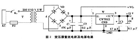 變壓器整流電路和穩(wěn)壓電源電路(如圖2虛線左邊所示),其主要由變壓器、二極管橋式電路、電容構(gòu)成。其中變壓器采用常規(guī)的鐵心變壓器,并將公共電網(wǎng)中的220 V交流電變?yōu)?2 V交流電,再通過二極管橋式電路進(jìn)行整流和電容C1濾波。整流信號由VC1引出。在此基礎(chǔ)上再接三端穩(wěn)壓器CW7812及電容C3、C4(如圖2虛線右邊所示),這樣整個電路就構(gòu)成穩(wěn)壓電源電路。由B點提供+12 V的直流電壓。