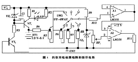 如圖4電路所示,自動斷電電路是由三極管VT2、電壓跟隨器A1、電壓比較器A2電阻R4、R5、R6、R7、R8、R11和可變電阻RP1構(gòu)成。當(dāng)充電開始時,電壓比較器輸出高電平,VT2導(dǎo)通,VT1也導(dǎo)通,指示燈發(fā)光二極管亮,給電池充電??梢韵仍O(shè)定轉(zhuǎn)換開關(guān)為1時給一節(jié)電池充電,轉(zhuǎn)換開關(guān)為2時給二節(jié)電池充電,依次類推,實現(xiàn)對1-4節(jié)電池充電。當(dāng)電充滿時,電壓比較器輸出低電平,VT2截止,VT1不導(dǎo)通,發(fā)光二極管熄滅,充電完畢。[page]
