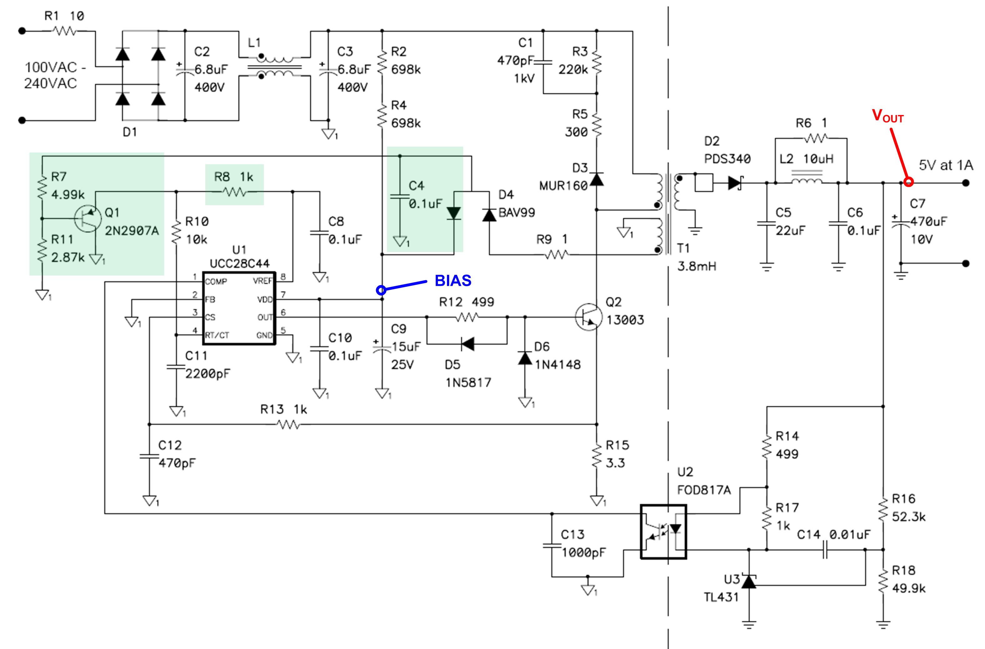 用于創(chuàng)建這種改進(jìn)型電流限制而增加的一些組件突出顯示在圖4所示原理圖中。對(duì)內(nèi)部振蕩器編程,通過(guò)R10、R8和C11設(shè)置反向轉(zhuǎn)換器的開(kāi)關(guān)頻率。一個(gè)內(nèi)部5V源通過(guò)R10和R8對(duì)C11充電。隨著偏置電壓下降,R7和R11的電阻分壓器開(kāi)啟Q1,并優(yōu)先于內(nèi)部5V源進(jìn)行控制,從而降低開(kāi)關(guān)頻率。偏置二極管(D4)現(xiàn)在必須為一種雙串聯(lián)二極管,這樣R7和R11才不會(huì)在啟動(dòng)期間使控制器的電流改道。需正確選擇R7和R11的值,以便讓Q1在正常運(yùn)行期間處于關(guān)閉狀態(tài),僅在偏置電壓降至約12V以下時(shí)才開(kāi)啟。