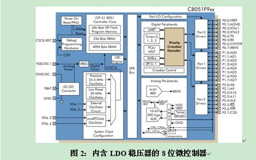 CMOS邏輯門的動(dòng)態(tài)功耗可寫為:P = C × V2 × f,其中C為負(fù)載電容,它是設(shè)計(jì)和工藝技術(shù)的函數(shù);V為供應(yīng)電壓;f則是開關(guān)頻率,它是應(yīng)用處理需求的函數(shù)。電源電壓是控制功耗的主要手段,因此若能像C8051F9xx內(nèi)含低壓差 (LDO) 穩(wěn)壓器一樣,直接在芯片中增加電壓轉(zhuǎn)換功能,就能提供穩(wěn)定的1.8V電壓給微控制器的數(shù)字核心 (參考圖2),使動(dòng)態(tài)功耗大幅下降。