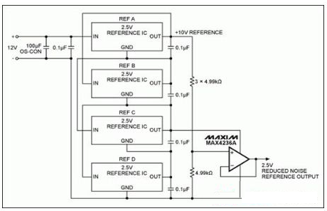圖1. 由四路2.5V基準(zhǔn)源串聯(lián)產(chǎn)生10V電壓,輸出分壓后得到2.5V,可使噪聲電壓減半。