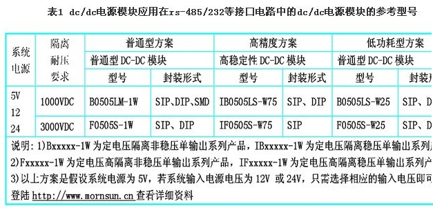 (4) DC/DC電源模塊應(yīng)用在rs-485/232等接口電路中的DC/DC電源模塊的型號參考,如表1所示?! ?br />