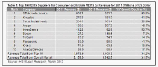 據(jù)IHS iSuppli公司的MEMS市場(chǎng)追蹤報(bào)告,2011年10大供應(yīng)商占消費(fèi)與移動(dòng)MEMS器件市場(chǎng)總體營(yíng)業(yè)收入的86%,蘋果公司的主要供應(yīng)商意法半導(dǎo)體在該領(lǐng)域遙遙領(lǐng)先。