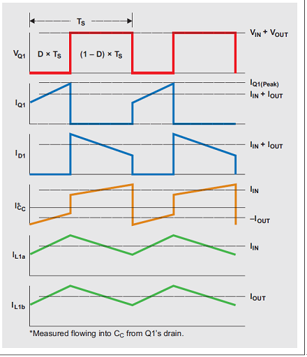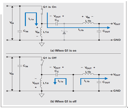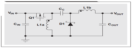 Q1 關閉時,L1b 的電壓必須為 VOUT,因為其與 COUT 并聯(lián)。由于 COUT 被充電至 VOUT,因此 Q1 關閉時 Q1 的電壓為 VIN + VOUT;這樣一來, L1a 的電壓便為相對于 Q1 漏極的 –VOUT。Q1 開啟時,充電至 VOUT 的電容 CC 與 L1b 串聯(lián);因此 L1b 的電壓為 +VIN,而二極管 D1 的電壓則為 VIN + VOUT。