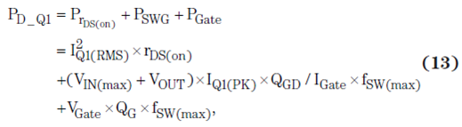 在相關環(huán)境溫度下,F(xiàn)ET 功耗額定值必須大于傳導損耗(FET rDS(on) 的函數(shù))和開關損耗(FET 柵極電荷的函數(shù))的和,計算方法如方程式 13 所示: