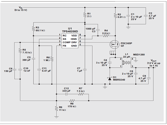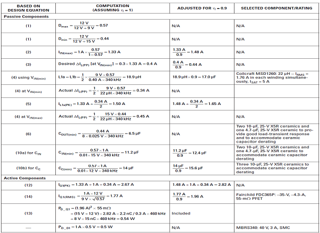 就本例而言,諸多要求都是針對一個 η= 0.9 峰值效率的 12-V、1-W 電源。負載為穩(wěn)態(tài),因此幾乎看不到負載瞬態(tài)。2-A 輸入電源為 9 到 15V。我們選擇了異步電壓模式控制器即 TI TPS40200,其工作在 340 和 460kHz 之間的開關頻率下。輸入端和快速電容器的最大允許紋波分別為彼此交叉最大電壓的 1%。最大輸出紋波為 25 mV,而最大環(huán)境溫度為 55ºC。由于 EMI 并不是問題,通過使用最小輸入電壓,我們選擇了具有更低電感值的電感。下一頁的表 1 概括了前面介紹的一些設計計算方法。我們忽略了方程式 7 到 9 以及方程式 11,因為使用了高 RMS 電流額定值的低 ESR 陶瓷電容。