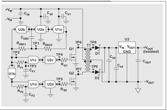 如果應(yīng)用要求 2 kV 以上的隔離電壓、60% 以上的轉(zhuǎn)換器效率或者標(biāo)準(zhǔn)組件可靠的有效性,那么分立設(shè)計(jì)就是一種能夠替代集成組件的低成本方案。分立 DC/DC 轉(zhuǎn)換器設(shè)計(jì)的缺點(diǎn)是需要做大量的工作——選擇穩(wěn)定的振蕩器結(jié)構(gòu)和先斷后通電路,選擇可以通過標(biāo)準(zhǔn)邏輯門有效驅(qū)動的MOSFET,適宜實(shí)施溫度和長期可靠性測試。所有這些努力都要花費(fèi)時(shí)間和資金。因此,在倉促進(jìn)行這樣一個計(jì)劃以前,設(shè)計(jì)人員應(yīng)該考慮到下列事項(xiàng):集成組件通常已通過溫度測試,并且擁有其他工業(yè)資質(zhì)。這些組件不僅僅是最可靠的解決方案,而且還擁有較快的上市時(shí)間。