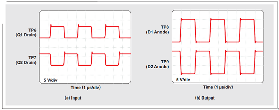 隔離變壓器 (T1) 擁有 2:1 的次級對初級匝數(shù)比、0.9 mH 的初級線圈電感,以及 3kV 的保證隔離電壓。圖 4 顯示了變壓器的輸入和輸出波形。