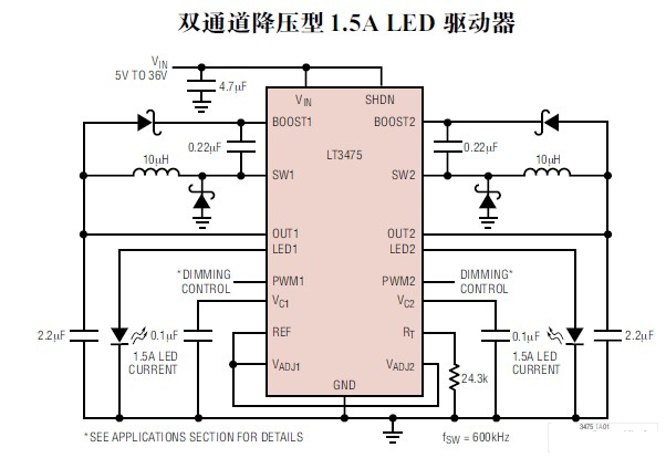 LTC3475利用高側的傳感,能與接地的LED陰極連接,而勿需大多數應用中的接地線,電流型的控制與準確的參考電壓,優(yōu)化了精心調節(jié)的動態(tài)回路,LED的電流恒定,波紋小。兩個通道已分隔Vadj和PWM信號,以便獨立操作。每一通道開關相互180°的相位差(異相),減少了兩通道上的輸出波紋,減少了污染“足跡”,降低成本,且附加有LED斷開保護和短路保護。