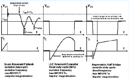 圖1所示為采用三種不同拓?fù)?準(zhǔn)諧振反激式拓?fù)?、LLC諧振拓?fù)浜褪褂密涢_(kāi)關(guān)技術(shù)的非對(duì)稱(chēng)半橋拓?fù)?的開(kāi)關(guān)的電壓和電流波形。